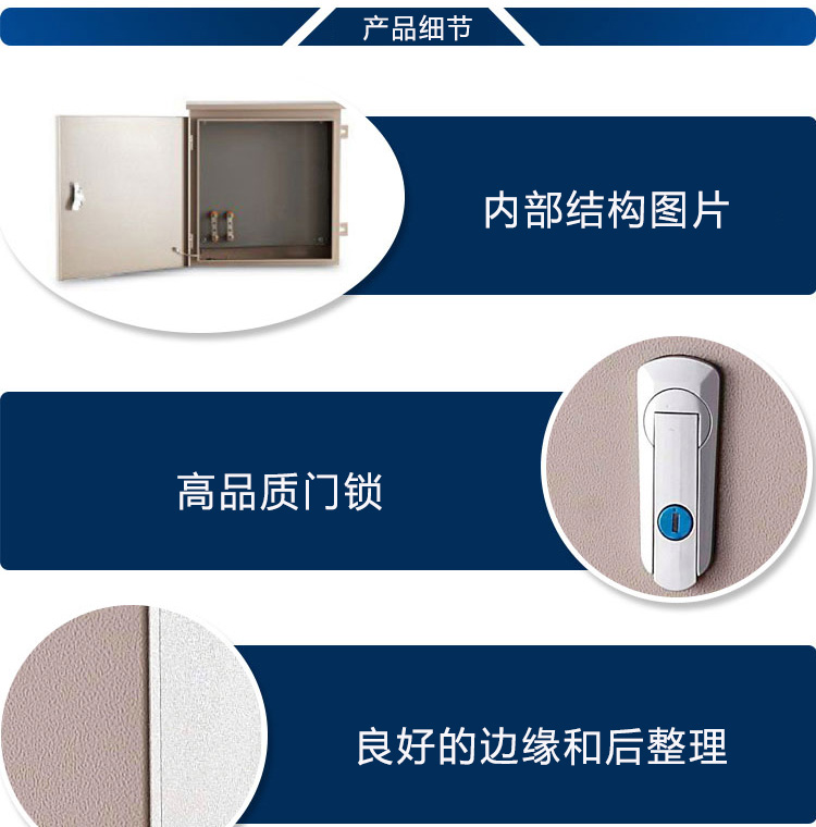 1、建筑開關配電箱采用1.5mm厚的Q235工程級冷軋?zhí)间摪?,經酸洗、硫化防銹處理后覆高亮度白室外專用粉;耐酸堿腐蝕,油氣污漬;表面光潔,不粉化,值得信賴。南域為您展示電箱,配電箱,低壓配電箱的內部結構,采用優(yōu)質配件制造。 | ![]() |